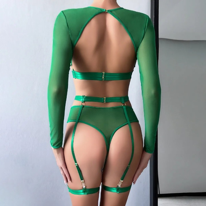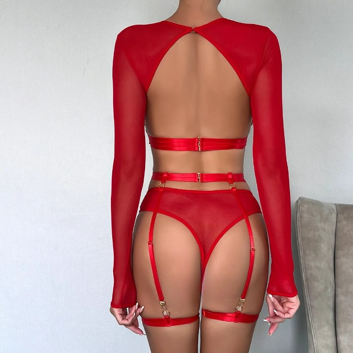 With its daring open bra and alluring long sleeves, the Ariana set transcends boundaries, teasingly showcasing your most intimate desires. The palette of colors, from the seductive depths of black to the fiery allure of neon pink, offers a spectrum to match your every mood.