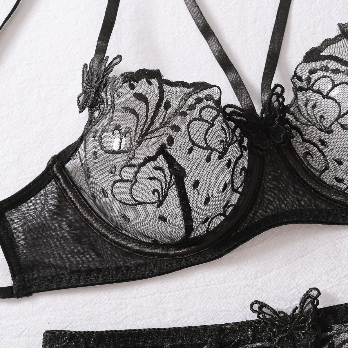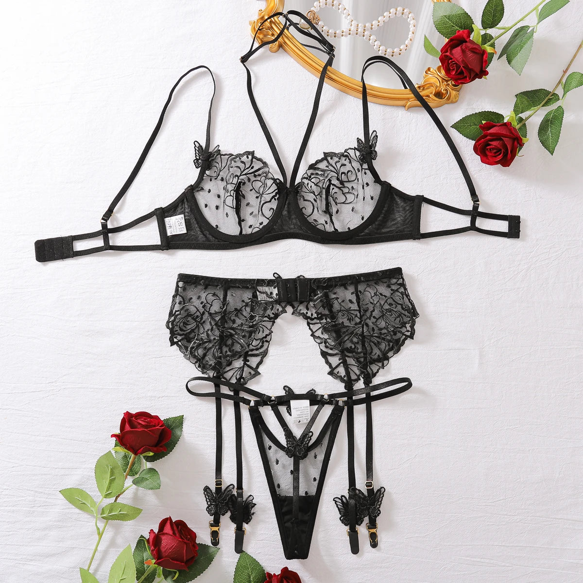 - Set Includes: Bra, Panties, Garter & Thigh Straps