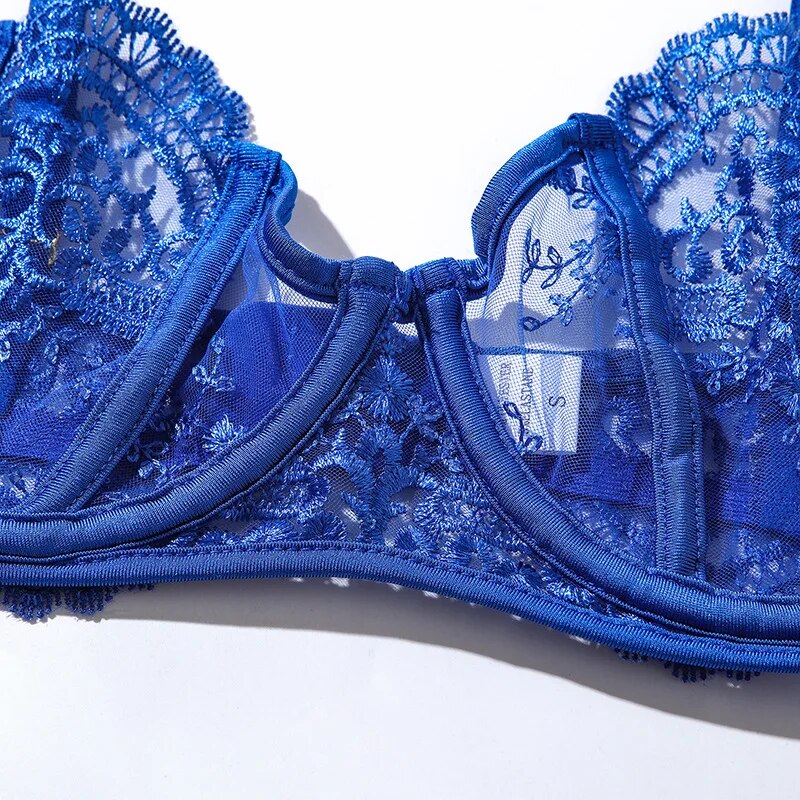 In a captivating shade of blue, the matching bra, thong, and garters conjure an atmosphere of mystery and sophistication. The bra, adorned with enchanting embroidery, features an enticing half cup design that teases with just the right amount of reveal. The underwire support ensures a subtle lift, accentuating your natural allure.
