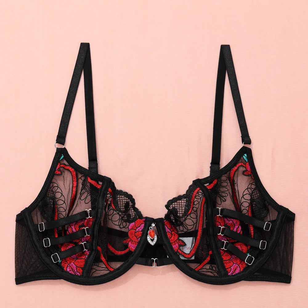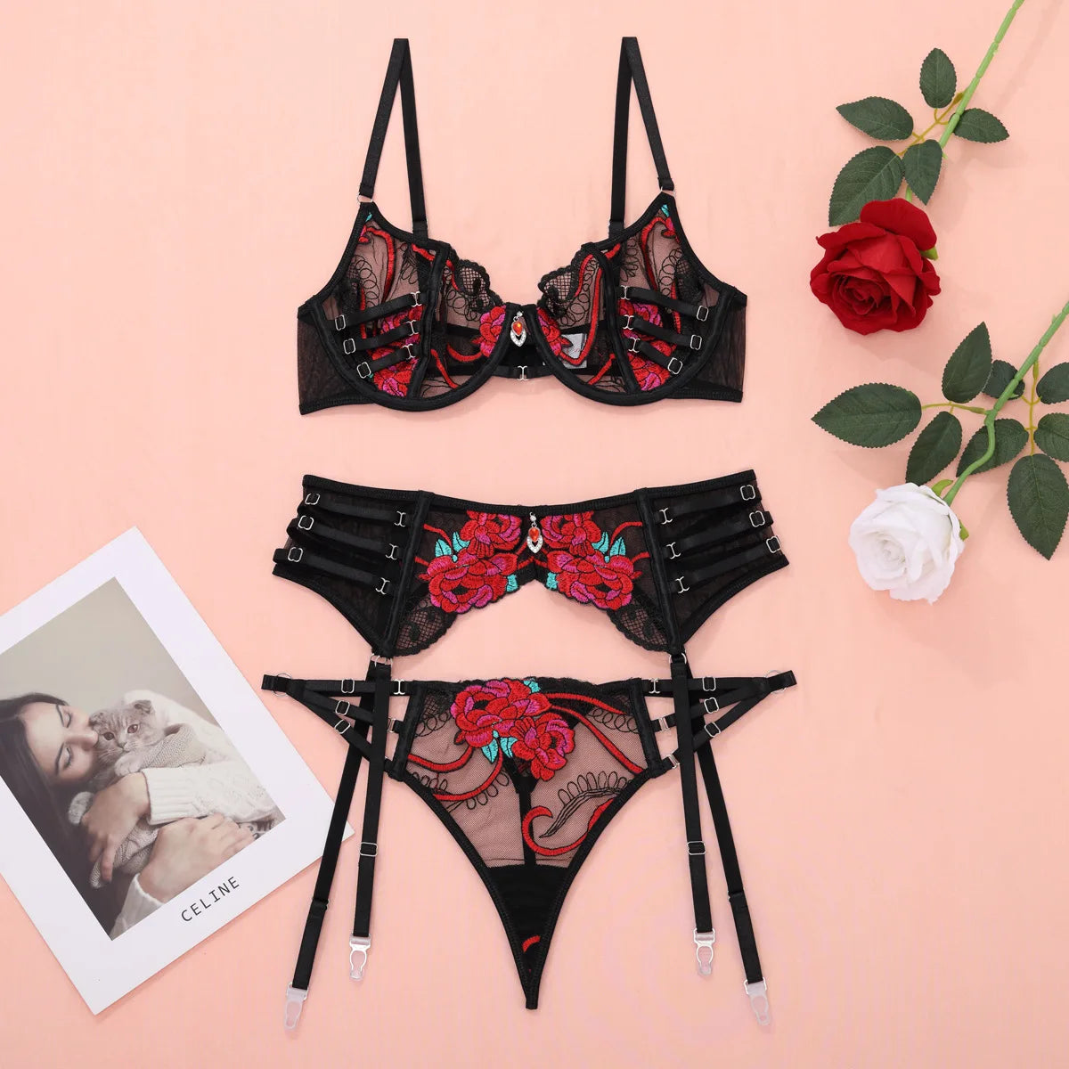 - Set Includes: Bra, Panties & Garter